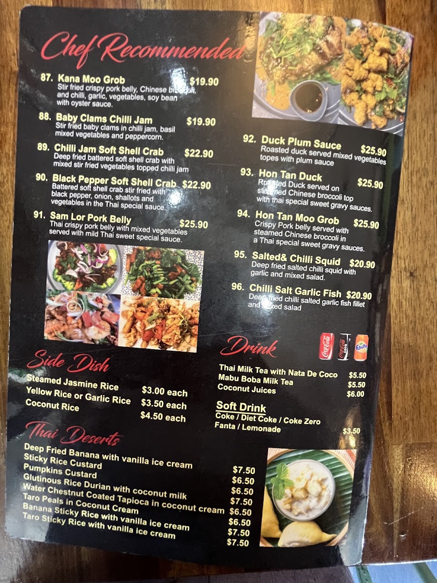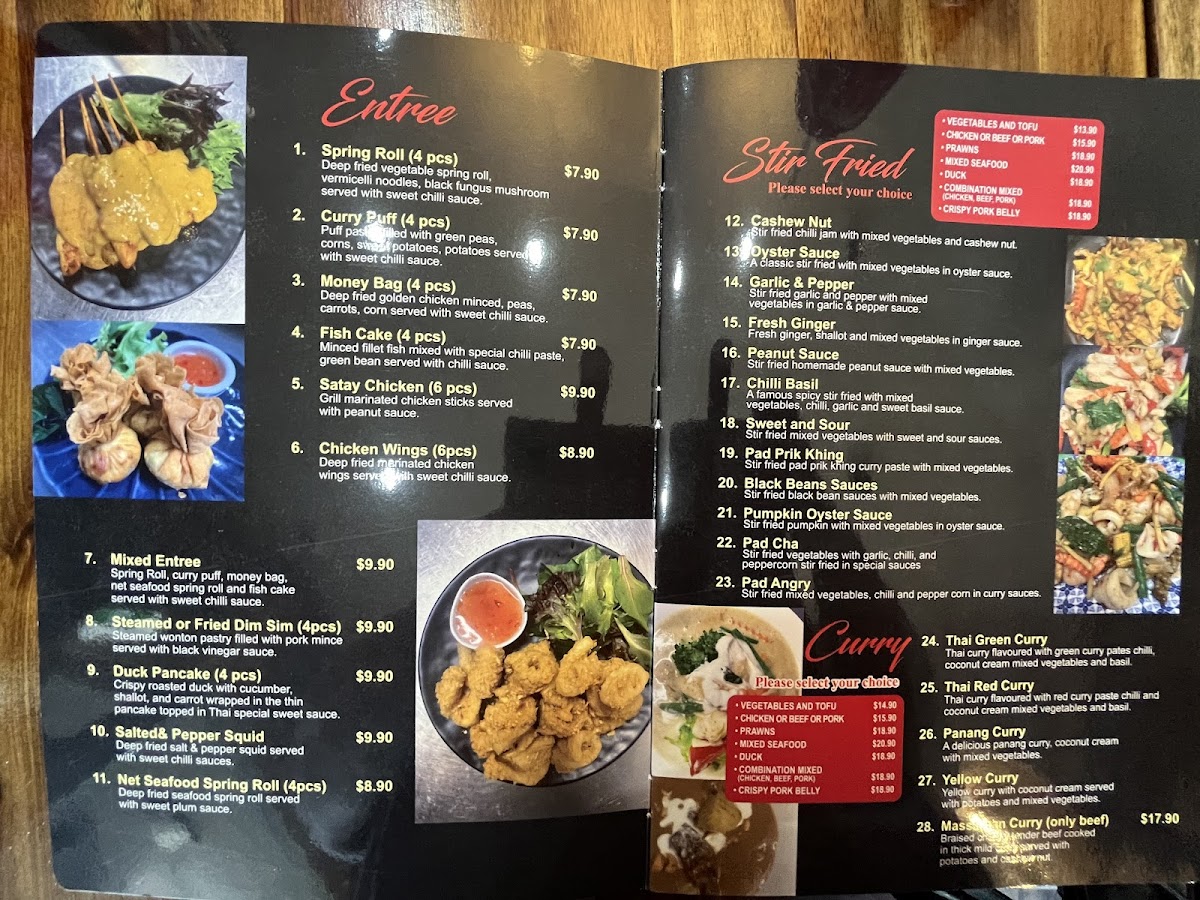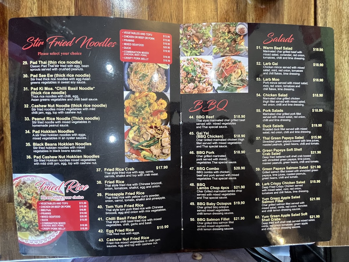 This menu is suitable for casual dining occasions, offering options for both light meals and more substantial plates. It is structured to accommodate a range of preferences from salads and grilled dishes to traditional Thai specialties. The menu allows for quick ordering as well as leisurely dining experiences.